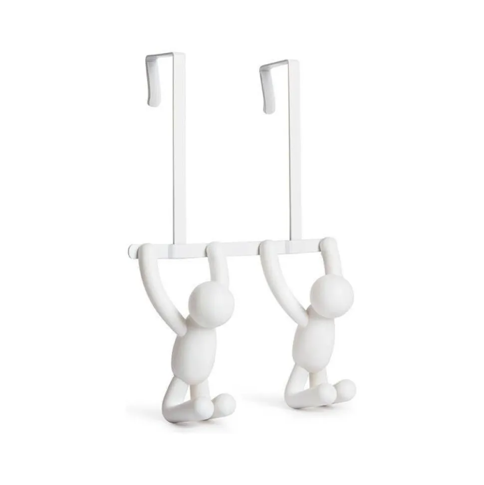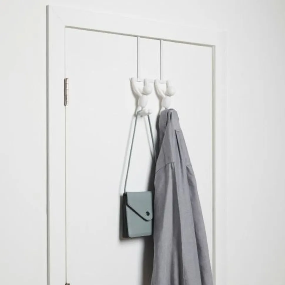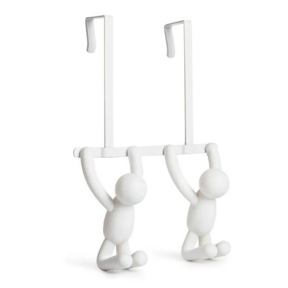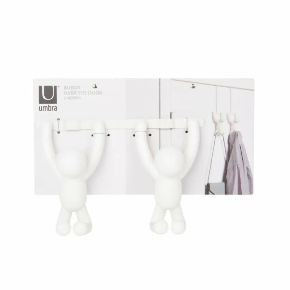 Zdobądź przestrzeń i wystrój od razu dzięki temu zabawnemu hakowi firmy Umbra, który można zamontować nad drzwiami. . BUDDY Over-the-Door tym razem występuje jako hak na drzwiach, świetny do przechowywania takich rzeczy jak kapelusze, szaliki, płaszcze i torebki. Ten element dekoracyjny ma bardziej aktywny wygląd niż typowy wieszak na drzwi, ponieważ Buddy wygląda jakby pozostawał w ruchu. Formowany z matowym wykończeniem i dostępny w kolorze czarnym lub białym, przeznaczony do drzwi o grubości do 3,8cm i wymiarach 31,8 x 21,6 x 10,8 cm.