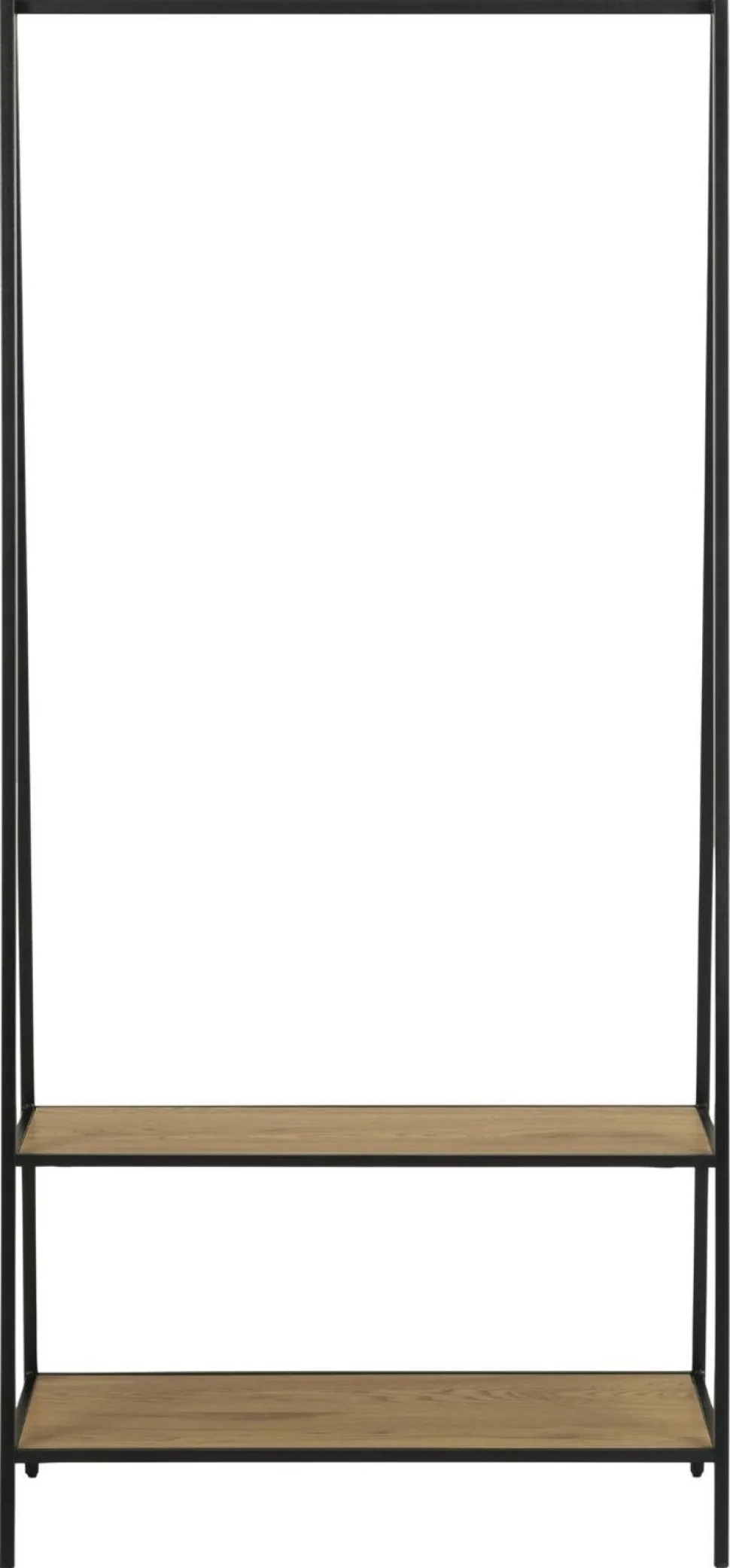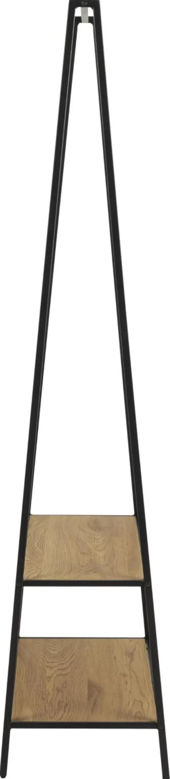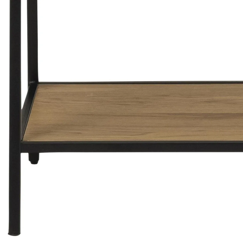 Wieszak Seaford posiada metalowy szkielet malowany proszkowo na czarno. W jego dolnej części znajdują się dwie szerokie półki z płyty MDF oklejone laminatem w kolorze dzikiego dębu. Na półkach z powodzeniem można przechowywać buty. W górnej części wieszak posiada umieszczoną w poprzek metalową rurkę, na której zawiesić można nawet duże elementy odzieży tj. kurtki czy długie sukienki. Seaford posiada delikatną, ale stabilną konstrukcję.