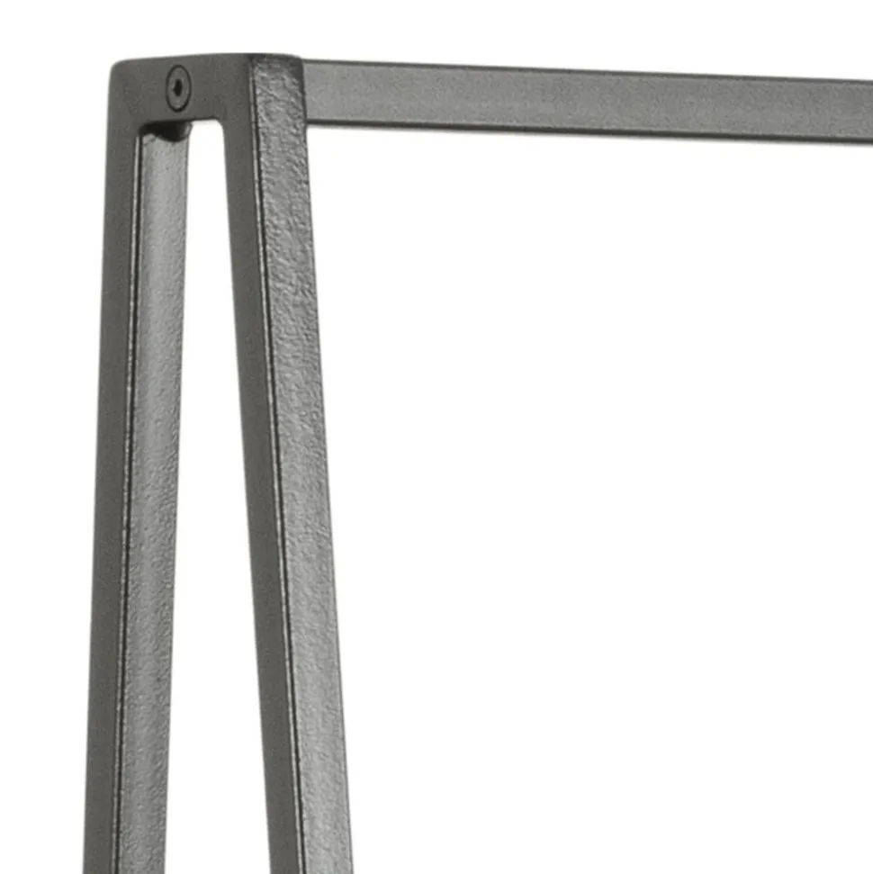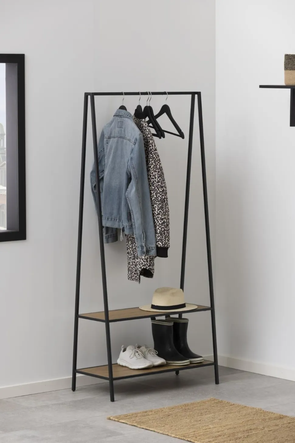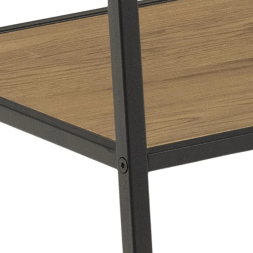 Wieszak Seaford posiada metalowy szkielet malowany proszkowo na czarno. W jego dolnej części znajdują się dwie szerokie półki z płyty MDF oklejone laminatem w kolorze dzikiego dębu. Na półkach z powodzeniem można przechowywać buty. W górnej części wieszak posiada umieszczoną w poprzek metalową rurkę, na której zawiesić można nawet duże elementy odzieży tj. kurtki czy długie sukienki. Seaford posiada delikatną, ale stabilną konstrukcję.