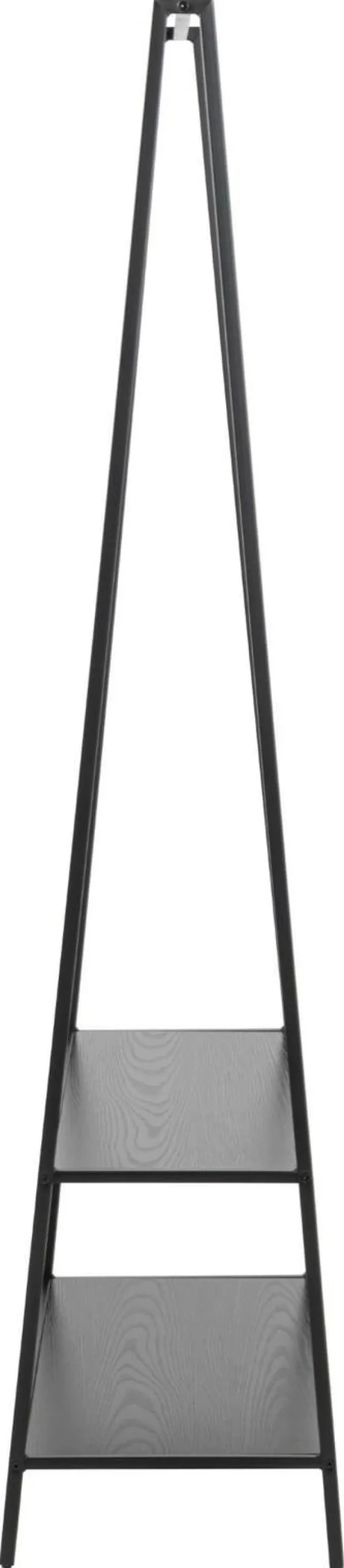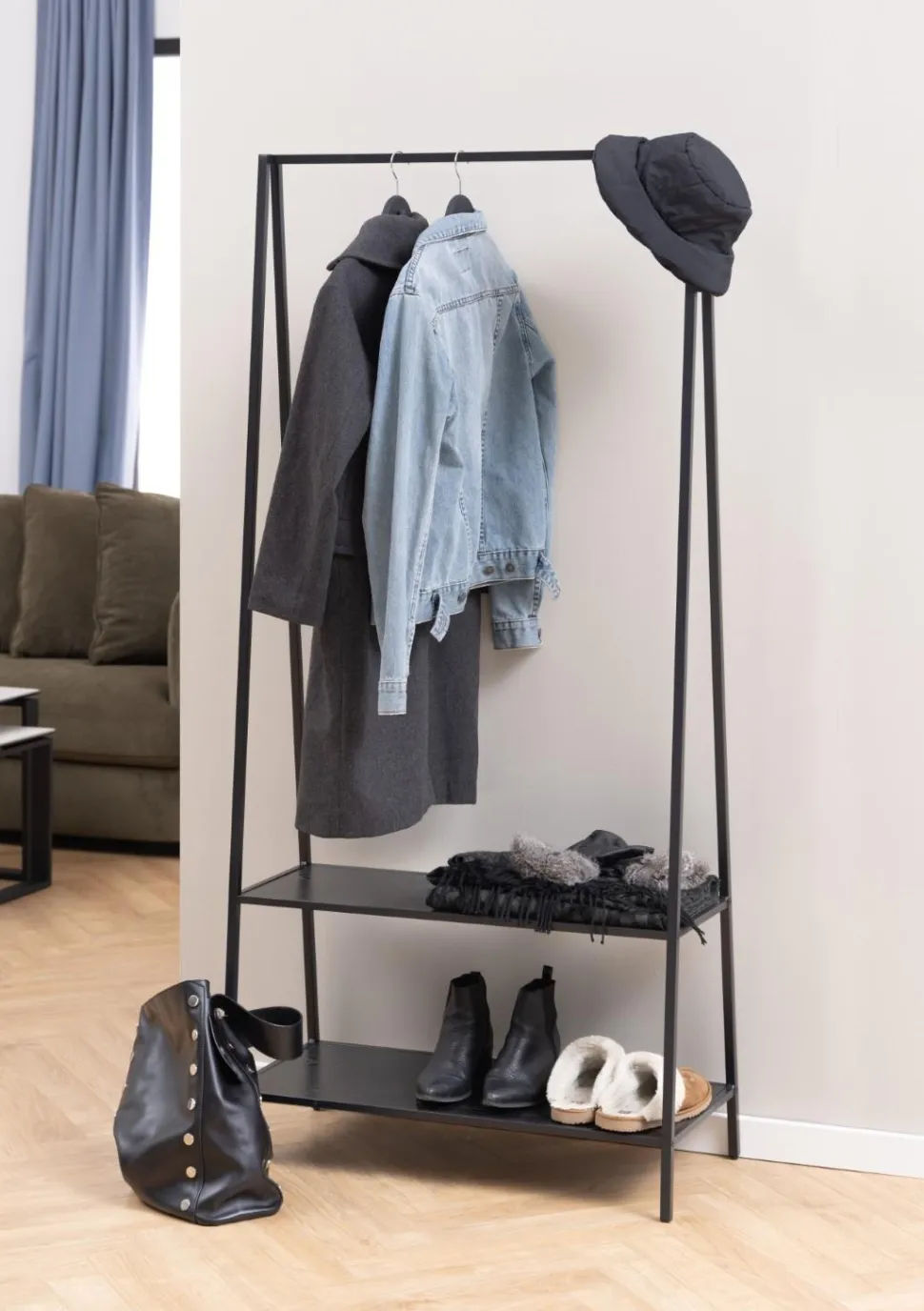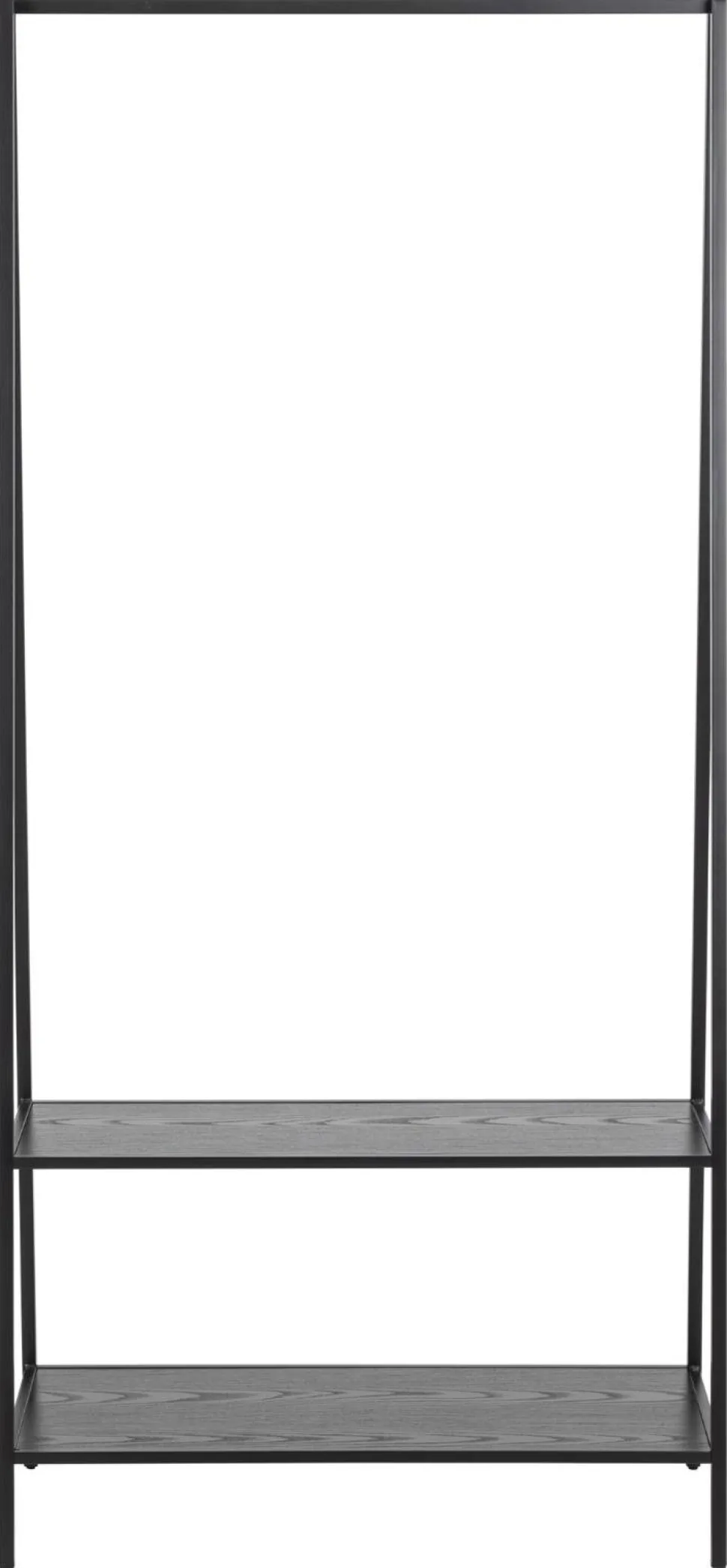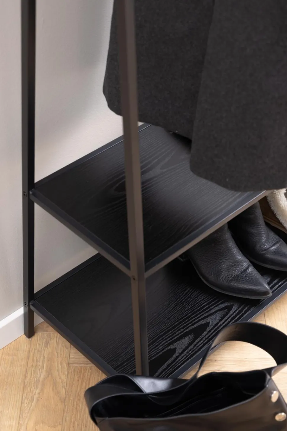 Wieszak Seafordposiada metalowy szkielet malowany proszkowo na czarno.W jego dolnej części znajdują się dwie szerokie półki z płyty MDF oklejone laminatem w tym samym kolorze.Na półkach z powodzeniem można przechowywać buty.W górnej części wieszak posiada umieszczoną w poprzek metalową rurkę, na której zawiesić można nawet duże elementy odzieży tj. kurtki czy długie sukienki. Seaford posiada delikatną, ale stabilną konstrukcję.