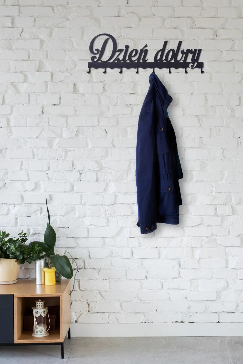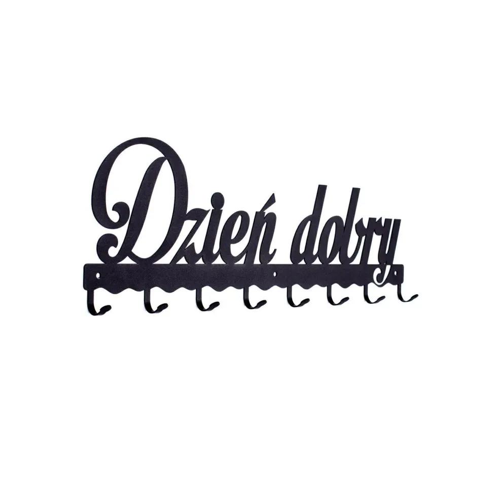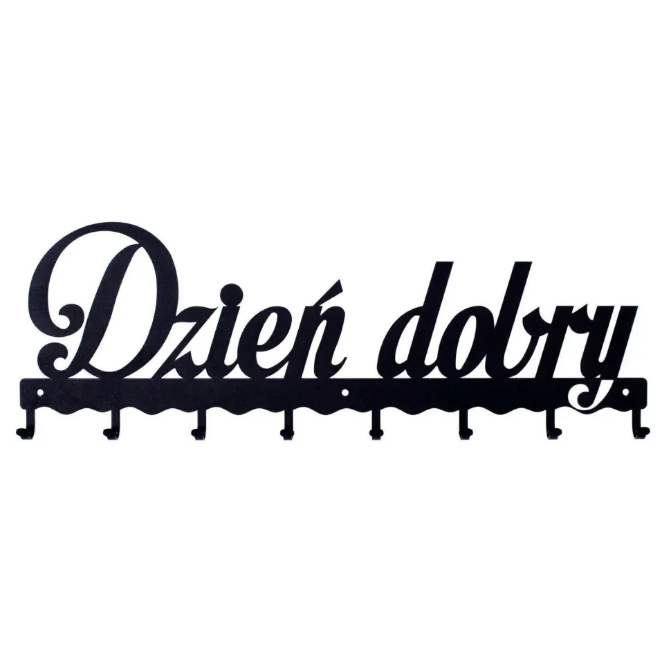 Wieszak ścienny Dzień dobry jest praktycznym rozwiązaniem do każdego przedpokoju, holu lub poczekalni. Wycinany laserowo uniwersalny napis ociepli każde wnętrze.Produkt wykonany został z wytrzymałego metalu malowanego proszkowo. Wieszak posiada 8 haczyków, o maksymalnym obiciążeniu 3kg każdy, które pomogą utrzymać porządek na korytarzu, holu czy poczekalni. Utrzymany w eleganckim stylu wieszak wtopi się we wnętrze dodając mu wyjątkowo przytulnego charakteru. Maksymalne obciążenie listwy to 24kg. Do wieszaka załączony jest zestaw montażowy, składający się z kołków, śrubek i zaślepek. Wysokość: 21cm Szerokość: 60cm.