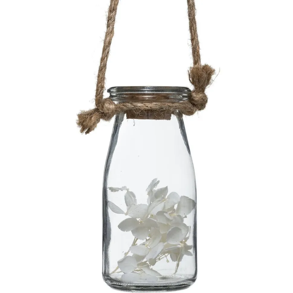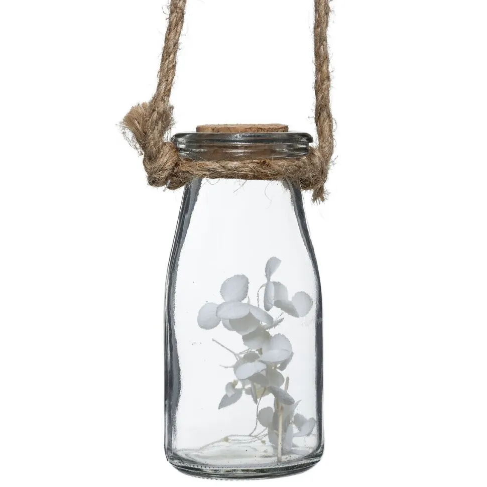 Oryginalna i rustykalna zawieszka z 4 suszonymi kwiatami to doskonały sposób na wprowadzenie romantycznego nastroju do każdego wnętrza. Zawieszka składa się z 4 przezroczystych szklanych butelek, wypełnionych suszonymi kwiatami, które są przymocowane do naturalnej drewnianej gałęzi za pomocą konopnych lin. Ta unikalna kombinacja materiałów tworzy autentyczny, poetycki i delikatny zestaw, który doda subtelnej elegancji do Twojego domu.