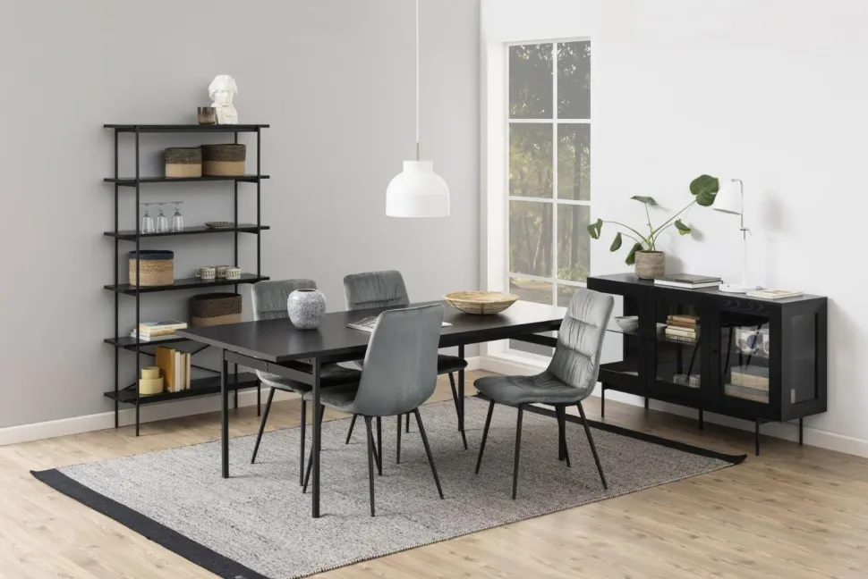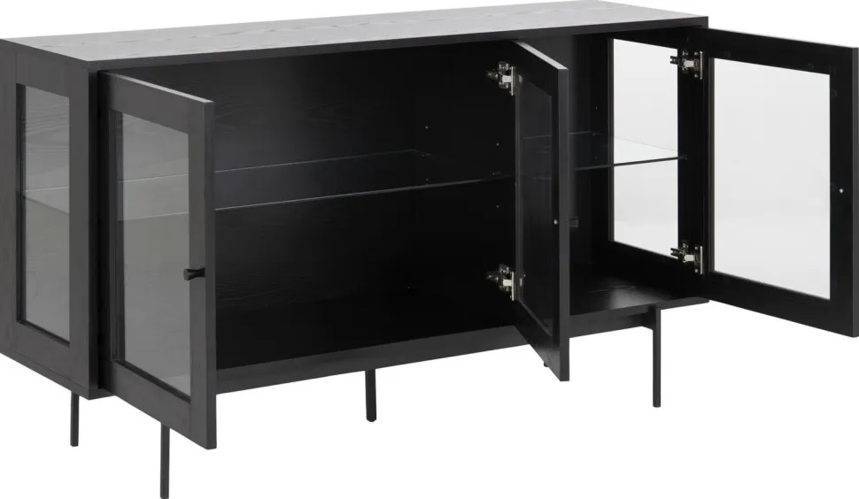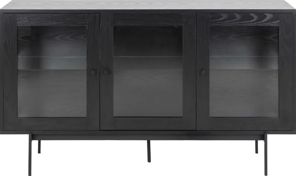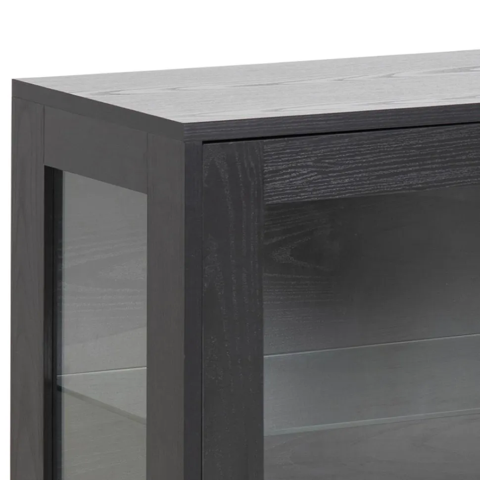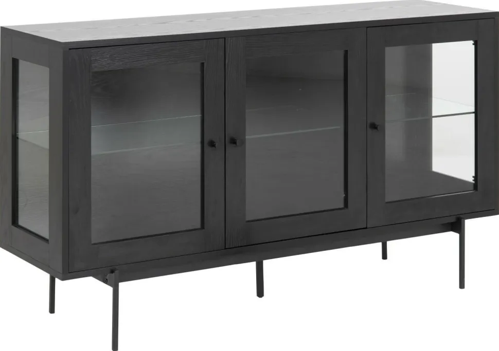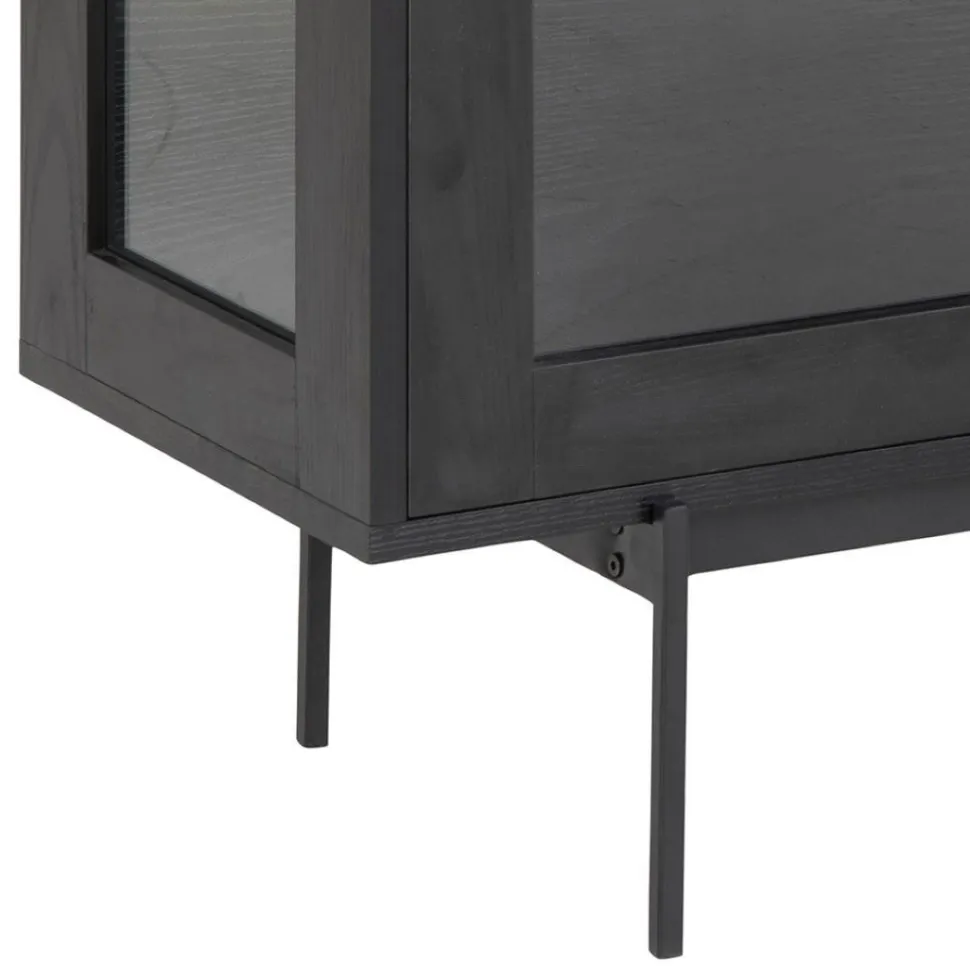 Czarna niska witryna na książki ANGUS to klasyczny mebel, który wykorzystasz nie tylko do ekspozycji zastawy stołowej, ale także jako miejsce na książki, pamiątki lub porcelanę. Jej korpus został stworzony z płyty MDF, która wykończona jest laminatem imitującym jesion. Charakterystycznym elementem tej zamykanej witryny na książki są przeszklenia, które zdobią frontowe drzwiczki, a dodatkowo znajdują się po bokach, dzięki czemu witryna będzie świetnie wyglądała w dużych przestrzeniach. Jej wnętrze podzielone jest na dwie części, które zamykane są za pomocą trzech frontów zwieńczonych eleganckimi czarnymi uchwytami. Wewnątrz znajdują się szklane półki, na których będziesz mógł pięknie wyeksponować swoje skarby. Całość podtrzymuje subtelna metalowa podstawa, malowana proszkowo na czarno. Regał witryna na książki będzie idealnym meblem do wnętrz nowoczesnych i loftów. Aby stworzyć jednolitą industrialną aranżację, skorzystaj z innych mebli z kolekcji Angus producenta Actona.
