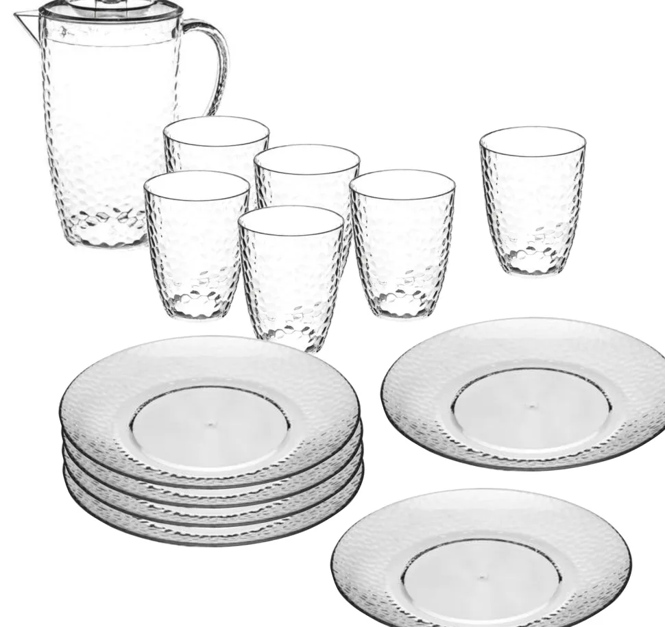 Zestaw zawiera 6 talerzy, 6 szklanek i dzbanek 2l. Dzbanek z przykrywką Estiva plastikowy, szklanki oraz talerze to niezastąpione elementy Twojej letniej kolekcji. Wykonan z trwałego polistyrenu, gwarantuje nie tylko wygodne korzystanie, ale także długotrwałą użytkowość. Solidna konstrukcja sprawia, że nie musisz obawiać się uszkodzeń czy stłuczeń, co czyni go idealnym wyborem na wszelkiego rodzaju spotkania oraz imprezy rodzinne. Posiadając pojemność 2 litrów, dzbanek doskonale sprawdzi się do serwowania zimnych napojów, soków, czy lemoniady. Szklanki idealnie pasujące do dzbanka o pojemności 380 ml bedą idealne do napojów w gorące dni. Zestaw talerzyków pozwoli na delektowanie się letnim deserem na łonie natury.