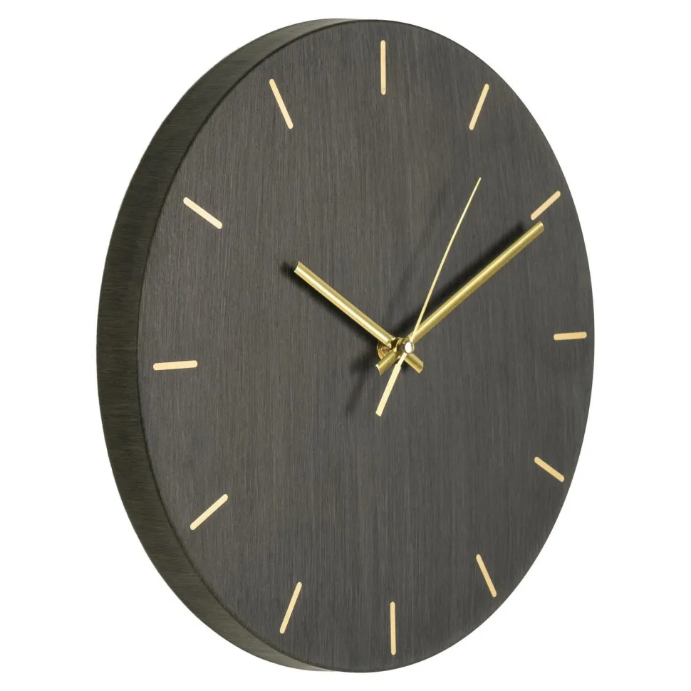 Okrągły, metalowy zegar Asti o kolorze oraz strukturze przypominającej naturalne drewno sprawdzi się w salonie w stylu boho albo jadalni w stylu skandynawskim. Zegar na ścianę Asti o średnicy 30 cm wykonany został z metalu. Tarcza zegara ozdobiona została kreskami oznaczającymi godzinę. Minimalistyczny zegar posiada standardowo trzy wskazówki w kolorze złotym. W zależności od ich funkcji są one grubsze lub cieńsze oraz zmienia się ich długość. Zegar zasilany jest na baterie AA, które nie zostały załączone do zegara.