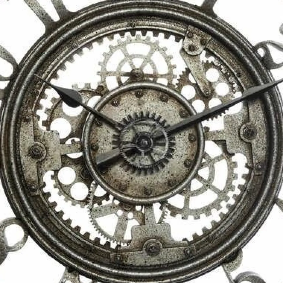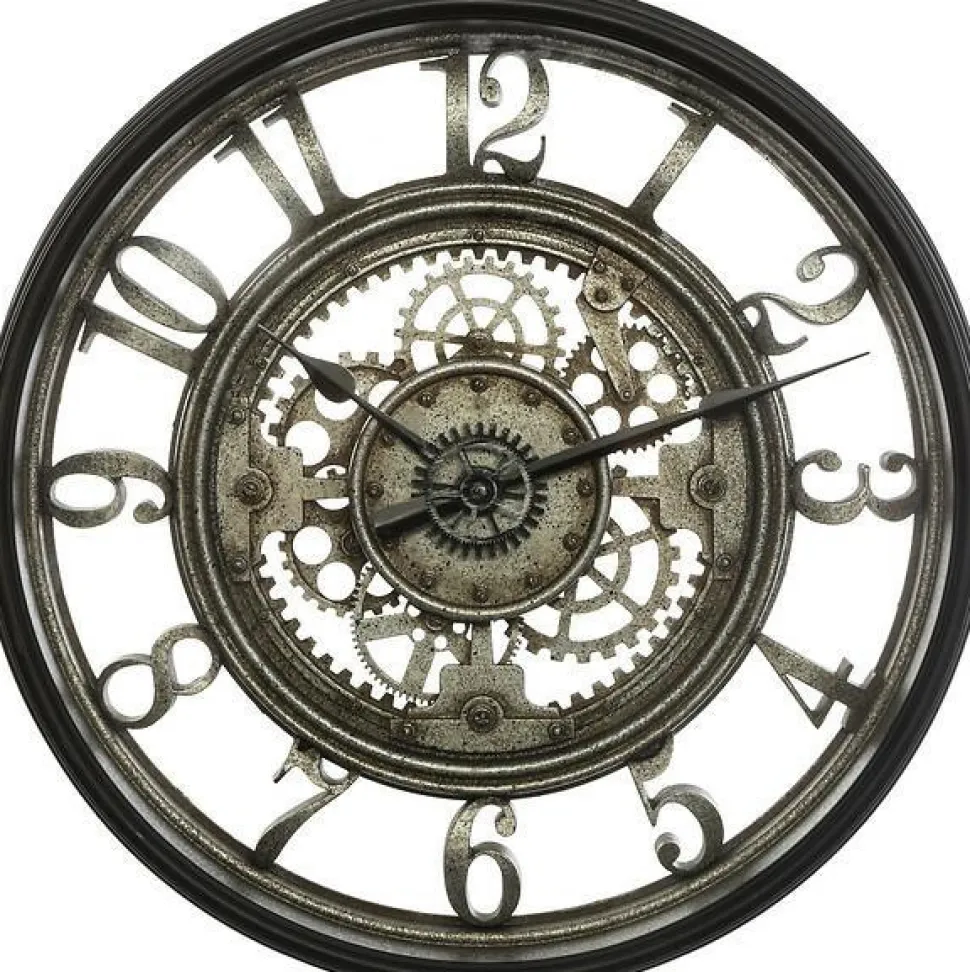 Dodaj industrialny akcent do swojego domu dzięki zegarowi Meca. Ten okrągły, srebrny dodatek ma ażurową tarczę przypominającą pracujące tryby i czarne wskazówki, które kontrastują z ciemnymi elementami tarczy. Zasilany bateriami, zegar ten jest idealny do każdego pomieszczenia w Twoim domu.