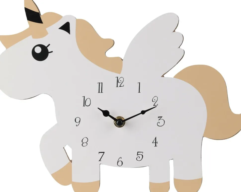 Zegar ścienny w kształcie jednorożca – Intesi Wprowadź czarujący element do pokoju swojego dziecka z zegarkiem Intesi! Wyjątkowy zegar ścienny został zaprojektowany w kształcie jednorożca i wniesie magiczny akcent do każdej przestrzeni. Działa na baterię AA (brak w zestawie). Spraw, by odmierzanie czasu stało się magiczne dla Twojej pociechy, dzięki naszemu zegarkowi w kształcie jednorożca! Zabawny zegarek ścienny z pewnością doda blasku radości i zachwytu każdemu pokojowi dziecięcemu, w którym zostanie umieszczony. Dzięki żywym kolorom i zabawnemu wzornictwu w kształcie jednorożca, zegar ścienny jest idealnym dodatkiem do pokoju dziecięcego, sali w przedszkolu lub gdziekolwiek chcesz wnieść ciepły i swobodny nastrój. Jego konstrukcja jest niezawodna, wykonany z wytrzymałej płyty MDF zapewniającej długotrwałe użytkowanie i działa na jedną baterię AA (brak w zestawie). O tym warto pamiętać! Zabawny i przyciągający wzrok sposób na nauczenie dzieci odmierzania czasu Łatwy montaż na dowolnej powierzchni, idealny do pokoju dziecięcego lub pokoju zabaw Trwały materiał zapewnia niezawodne użytkowanie i długotrwałą jakość Działa na jednej standardowej baterii AA (brak w zestawie), zapewniając ekonomiczne użytkowanie