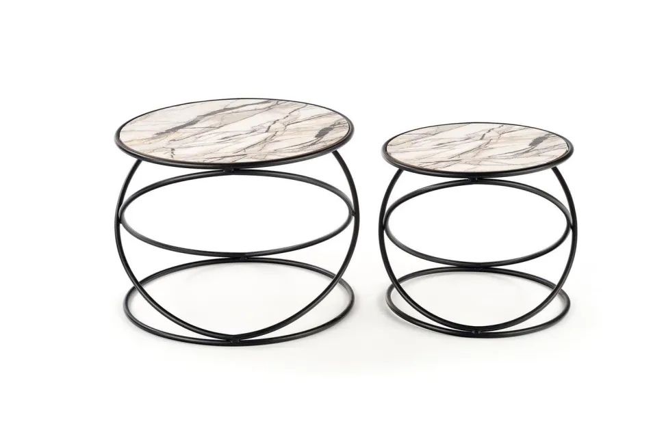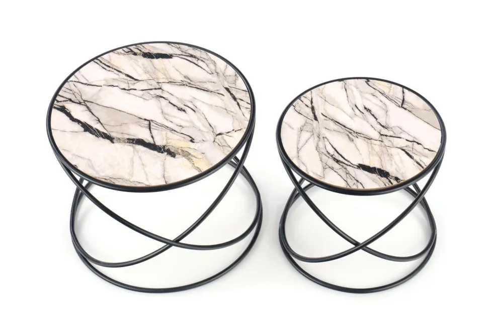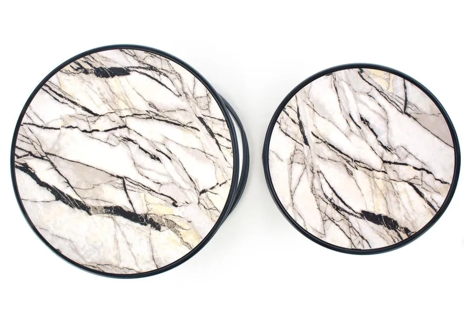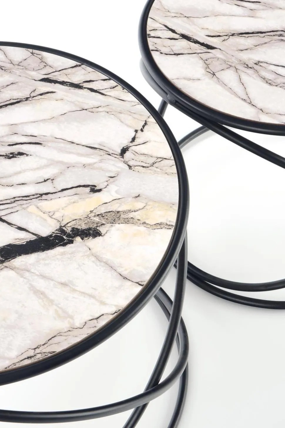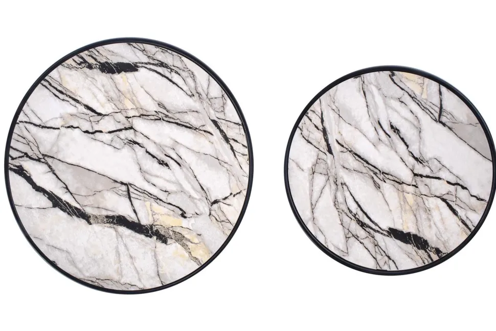Dodatkowo, blaty mają piękny kształt okrągły, co nadaje im nowoczesny charakter. Materiał, z jakiego wykonano stelaż stolików to metal malowany proszkowo, co gwarantuje trwałość i odporność na uszkodzenia. Stelaż ma elegancki, czarny kolor, który pięknie kontrastuje z białym marmurowym kolorem blatu. Ta kombinacja kolorów nadaje stolikom wyjątkowego charakteru i sprawia, że będą one doskonale komponować się z różnymi stylami wnętrz. Nie tylko wygląd jest istotny, ale także funkcjonalność. Dzięki swoim rozmiarom, stoliki kawowe są idealne do postawienia obok kanapy lub fotela. Możesz na nich postawić filiżankę kawy, książkę, czy ulubiony magazyn, mając wszystko pod ręką.