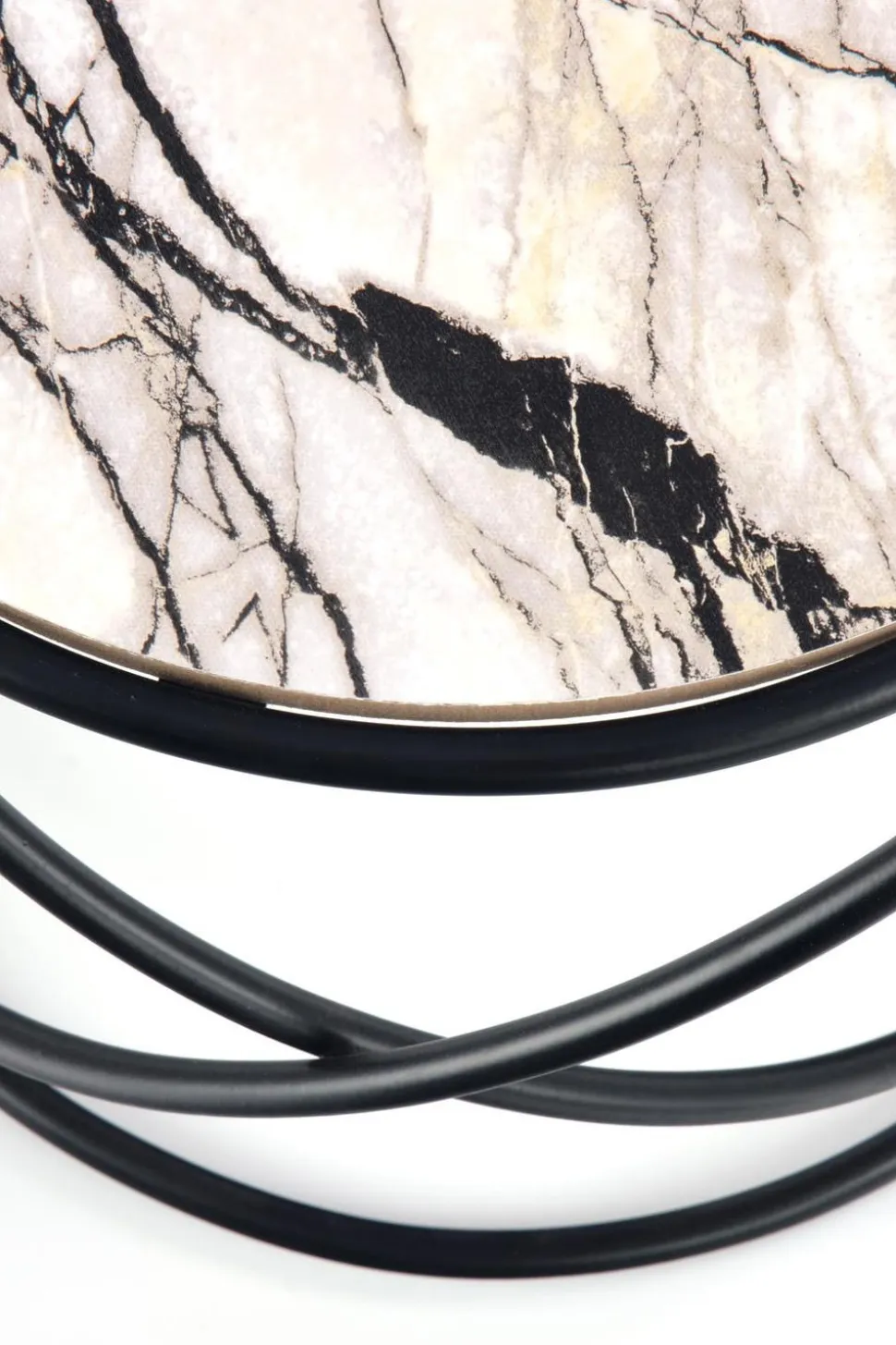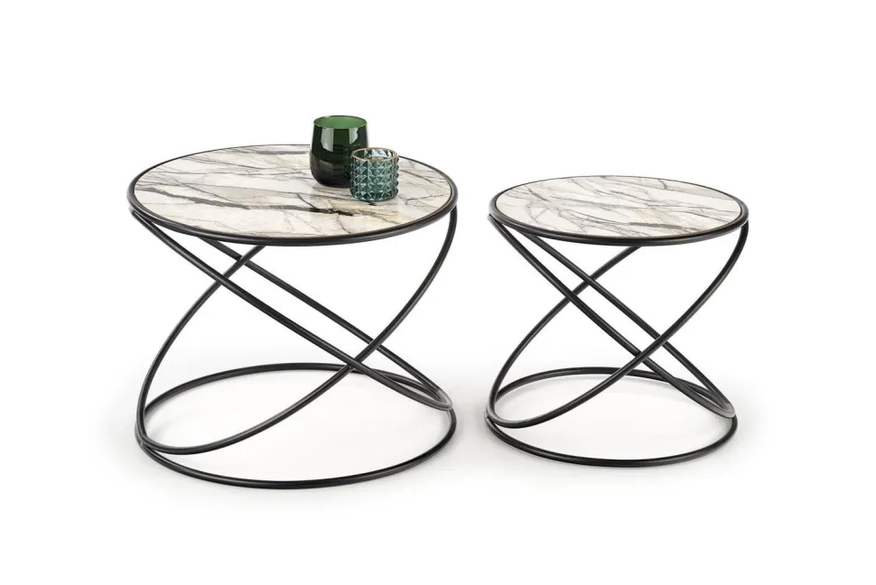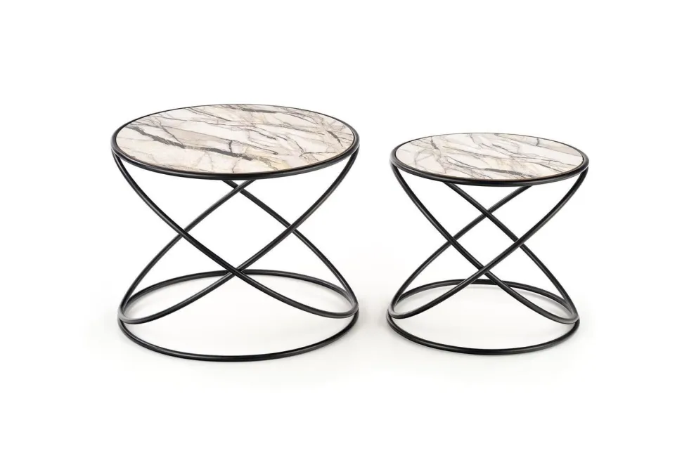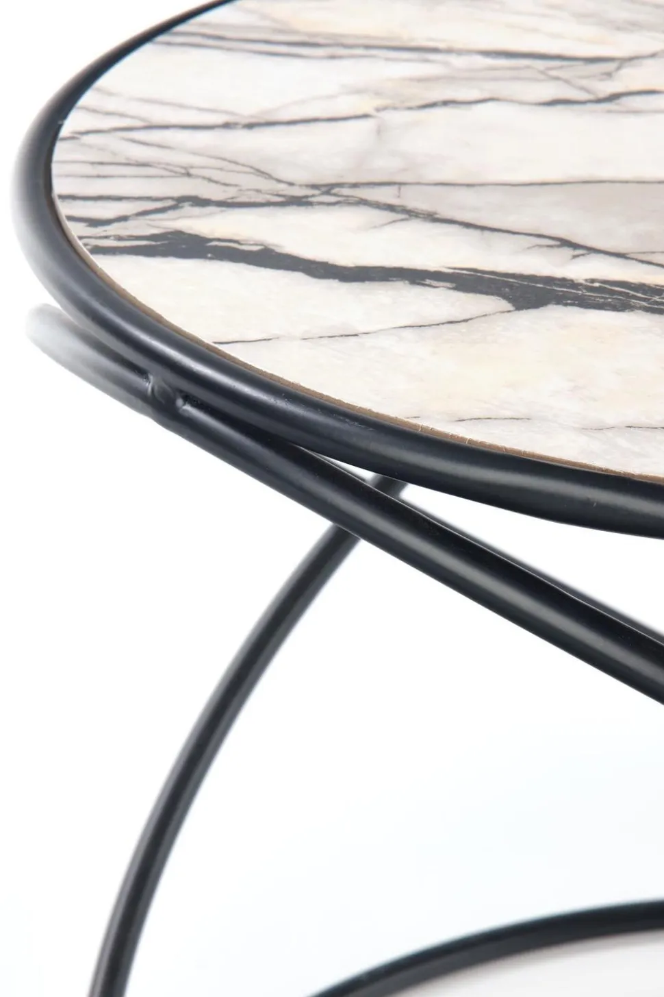 Dodatkowo, blaty mają piękny kształt okrągły, co nadaje im nowoczesny charakter. Materiał, z jakiego wykonano stelaż stolików to metal malowany proszkowo, co gwarantuje trwałość i odporność na uszkodzenia. Stelaż ma elegancki, czarny kolor, który pięknie kontrastuje z białym marmurowym kolorem blatu. Ta kombinacja kolorów nadaje stolikom wyjątkowego charakteru i sprawia, że będą one doskonale komponować się z różnymi stylami wnętrz. Nie tylko wygląd jest istotny, ale także funkcjonalność. Dzięki swoim rozmiarom, stoliki kawowe są idealne do postawienia obok kanapy lub fotela. Możesz na nich postawić filiżankę kawy, książkę, czy ulubiony magazyn, mając wszystko pod ręką.