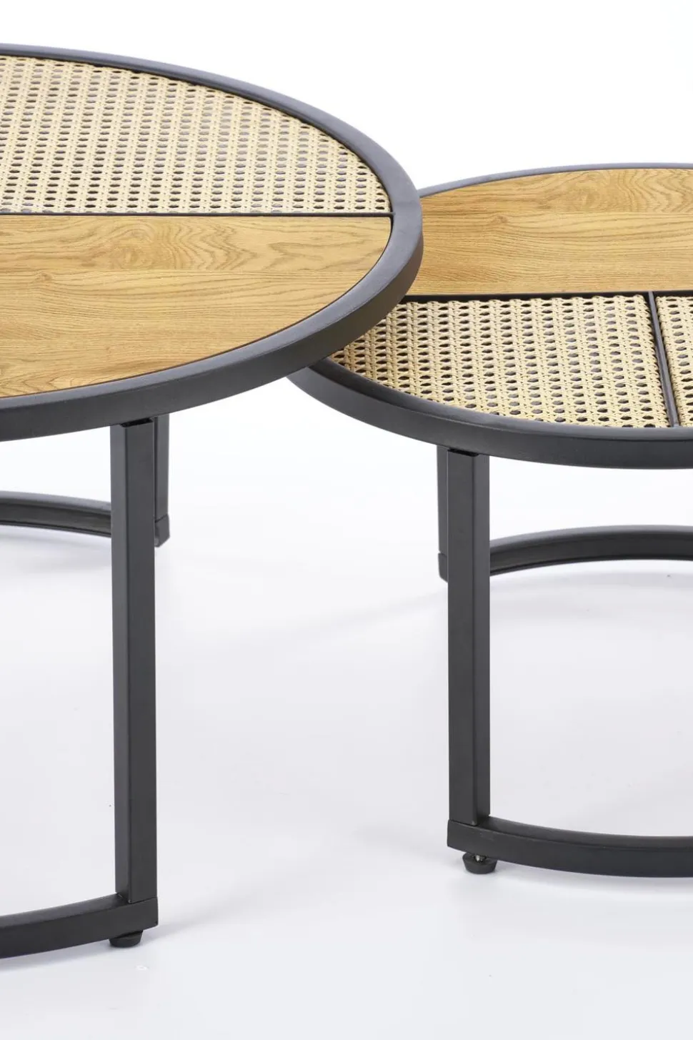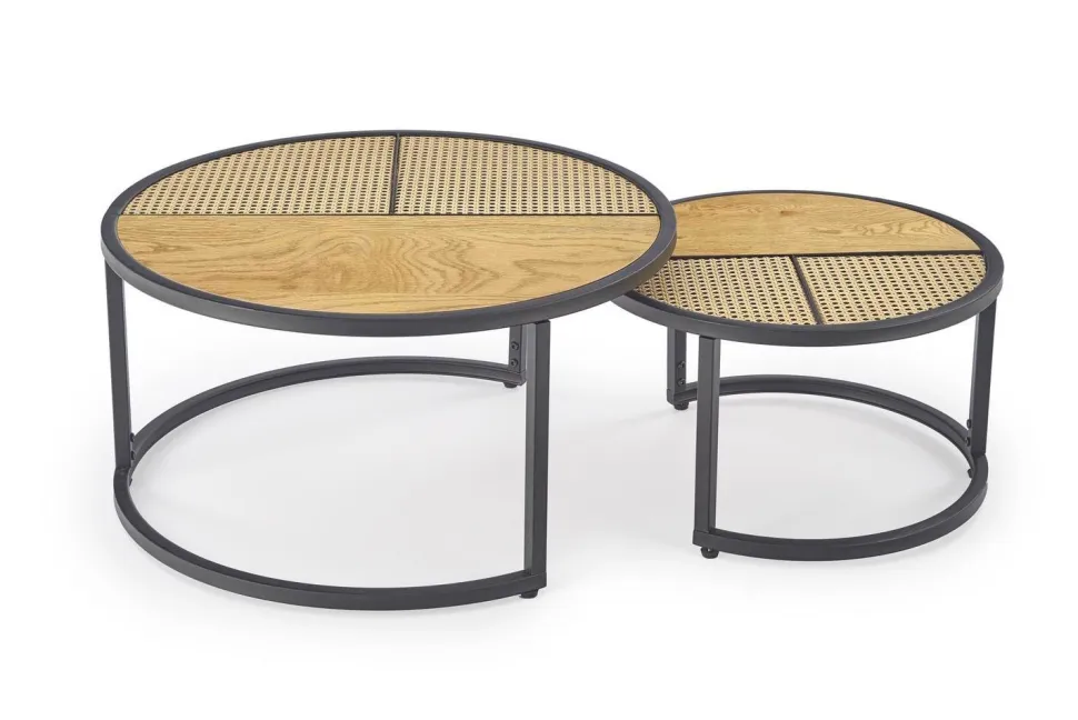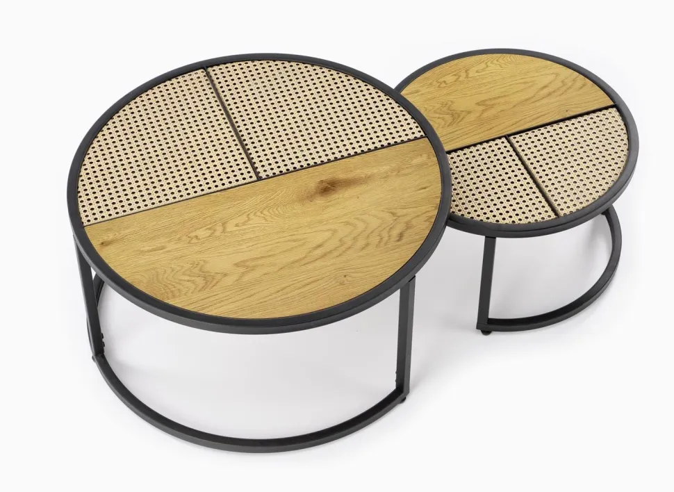 Stoliki mają różne wymiary: fi 70/36 oraz fi 50/30 cm, co pozwala na dowolne ustawienie ich w pomieszczeniu. Blaty wykonane z rattanu syntetycznego są łatwe w utrzymaniu czystości, a jednocześnie dodają lekkości i elegancji. Stelaż z metalu malowanego proszkowo w kolorze czarnym zapewnia stabilność i wytrzymałość. Zestaw 2 stolików kawowych Namiga to nie tylko piękny dodatek do Twojego salonu, ale również praktyczne rozwiązanie.