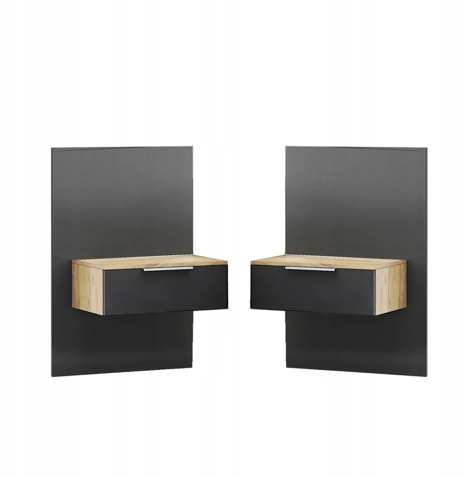 - Zestaw składa się z dwóch szafek nocnych w kolorze dąb/szary, idealnych do sypialni