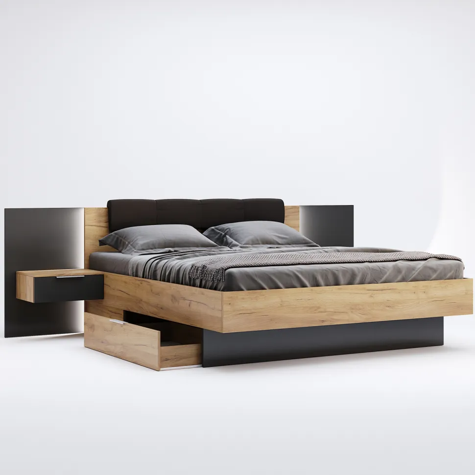 Fronty w kolorze szarym o matowym wykończeniu dodają elegancji i nowoczesności, pasując zarówno do klasycznych, jak i bardziej nowatorskich aranżacji sypialni. Szafki zostały wyposażone w trzyczęściowe teleskopowe prowadnice z pełnym wysuwem, co ułatwia dostęp do ich wnętrza oraz zapewnia wygodę użytkowania.