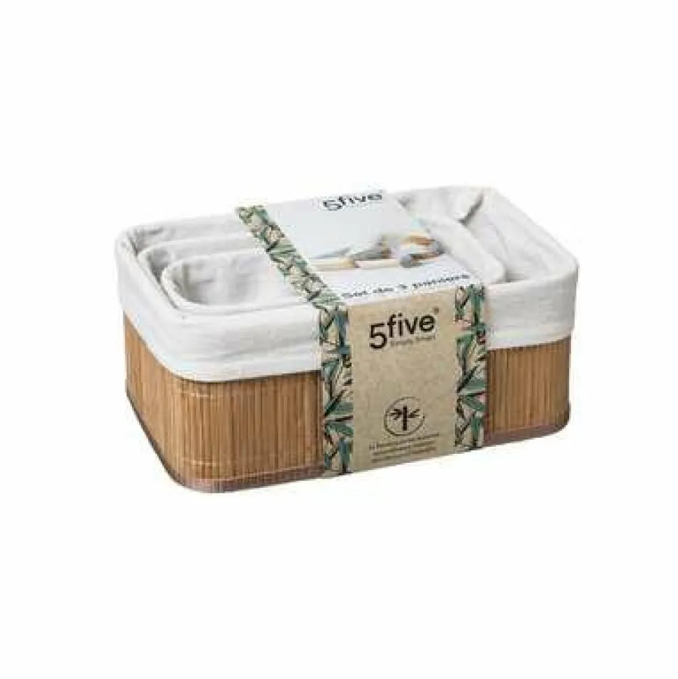 Zestaw 3 koszy Vannerie| 5five Simply SmartZorganizuj się dzięki zestawowi 3 koszy do regału 5five Simply Smart. Lekkie i wytrzymałe pudełka otoczone są metalowym zabezpieczeniem, dzięki czemu można je łatwo wyciągnąć, jednocześnie chroniąc swoje przedmioty. Szukasz koszy do przechowywania, które są zarówno stylowe, jak i praktyczne? Nie szukaj dalej niż nasz zestaw Vannerie. Wykonane są z wysokiej jakości bambusa i płyty MDF, co zapewnia maksymalną trwałość i długowieczność. Pudełka są nie tylko trwałe i praktyczne, ale także świetnie wyglądają w każdym otoczeniu. Jest to idealny rozmiar do porządkowania książek, czasopism, papierów i innych przedmiotów na każdym regale.Wymiary koszy: mały model szer. 20 x gł. 10 x wys. 8 cm,model średni szer. 25 x gł. 15 x wys. 10 cm,duży model szer. 30 x gł. 20 x wys. 12 cm. Więc jeśli szukasz stylowego rozwiązania do przechowywania, które jest eleganckie, kup nasz zestaw koszy Vannerie do regału już dziś i ciesz się funkcjonalnością!O tym warto pamiętać!Solidna i trwała konstrukcja ze wzmocnionymi krawędziami zapewnia bezpieczeństwo przedmiotów w środkuTrzy rozmiary koszyWygodny rozmiar pozwala zmaksymalizować przestrzeń do przechowywania w regałach lub na półkachWykonany z bambusa dla lekkości i elegancji