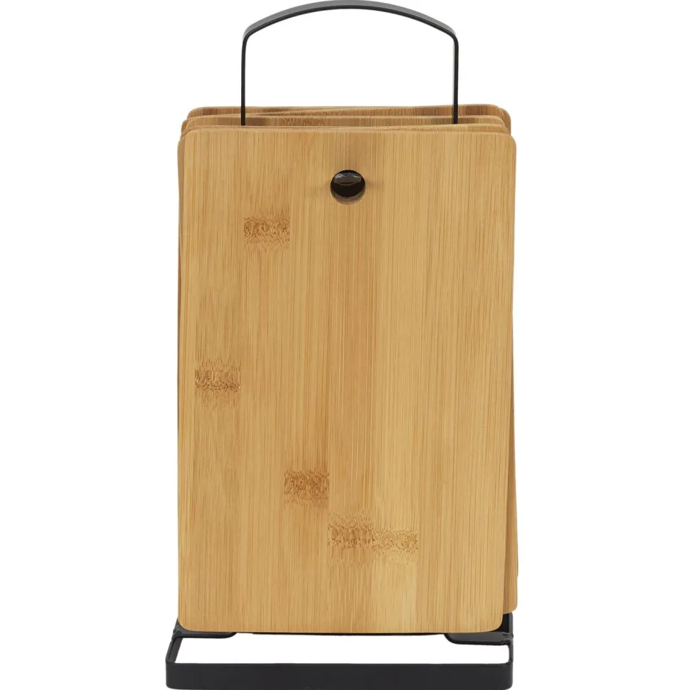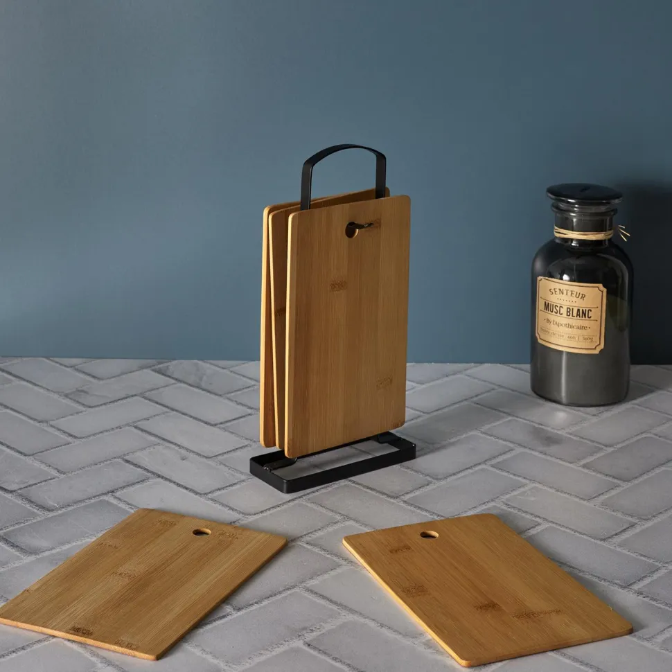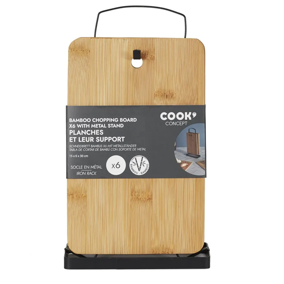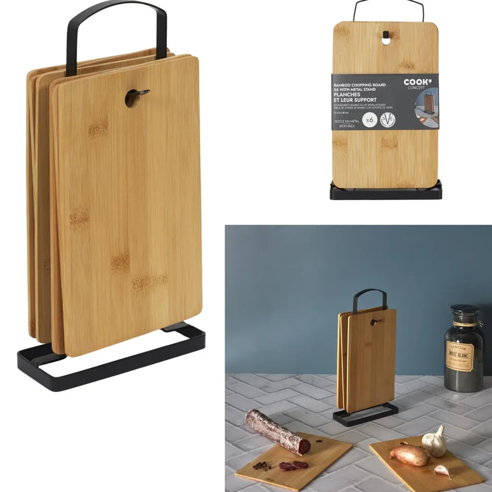 - Zestaw składa się z 6 bambusowych desek do krojenia umieszczonych na metalowym stojaku.