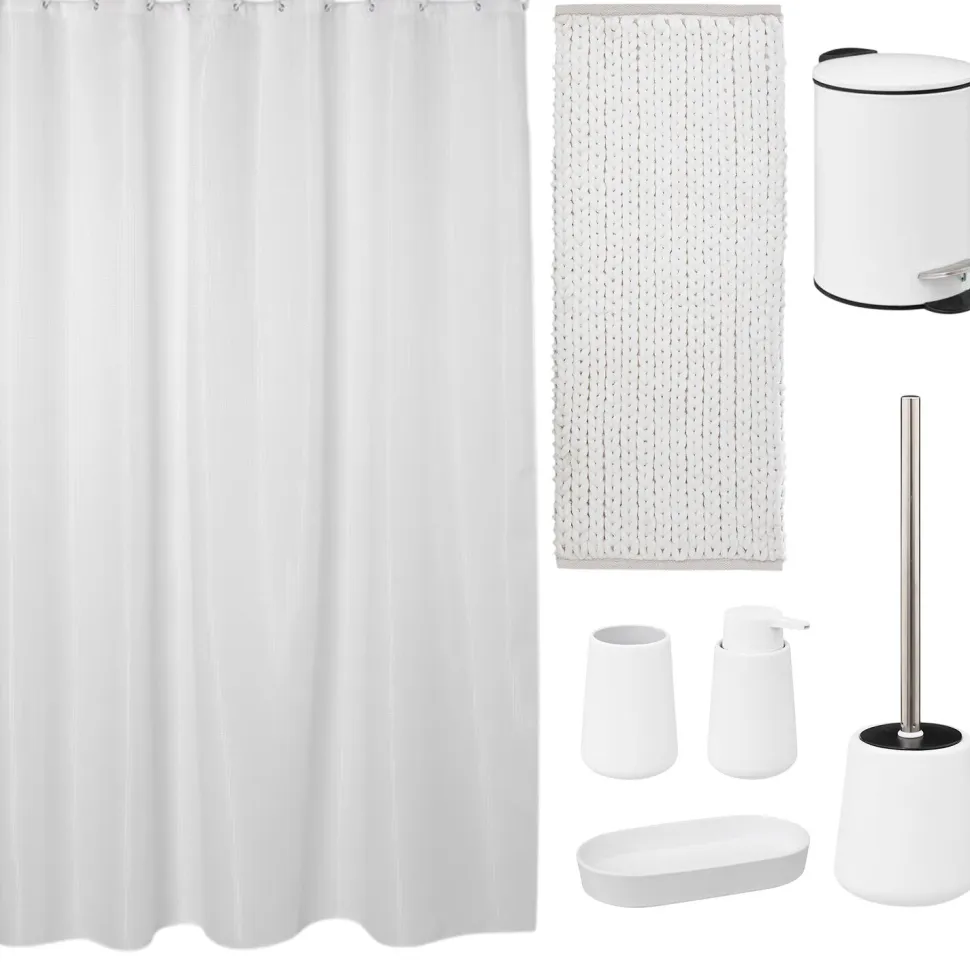 Zestaw akcesoriów łazienkowych Colors I biały to harmonijne połączenie stylu i funkcjonalności, które wprowadzi świeżość i elegancję do każdej łazienki. W jego skład wchodzą: mydelniczka, kubek, dozownik na mydło, szczotka toaletowa, dywanik łazienkowy 50×120 cm, zasłona prysznicowa 200×180 cmoraz kosz na śmieci 3L. Zestaw został zaprojektowany z myślą o osobach ceniących spójność aranżacyjną oraz minimalistyczny wygląd. Jasna kolorystyka nadaje wnętrzu wrażenie czystości i przestronności, idealnie pasując zarówno do nowoczesnych, jak i klasycznych łazienek.