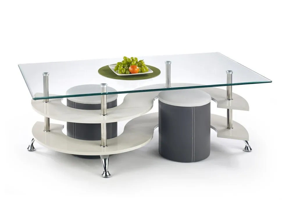 Ten nowoczesny stolik kawowy z pufami jest idealnym dodatkiem do Twojego wnętrza, dodając elegancji i nowoczesności do każdego pomieszczenia. Jego stylowe wykonanie przyciąga wzrok i sprawia, że tworzy on unikalną atmosferę w Twoim domu. Jedną z największych zalet tego zestawu jest wielofunkcyjność. Zestaw zawiera pufy, które mogą służyć jako dodatkowe miejsce do siedzenia lub jako podnóżki. To idealne rozwiązanie, gdy masz gości lub po prostu chcesz zrelaksować się po ciężkim dniu. Pufy są wygodne i komfortowe, zapewniając Ci przyjemne doświadczenia użytkowania.