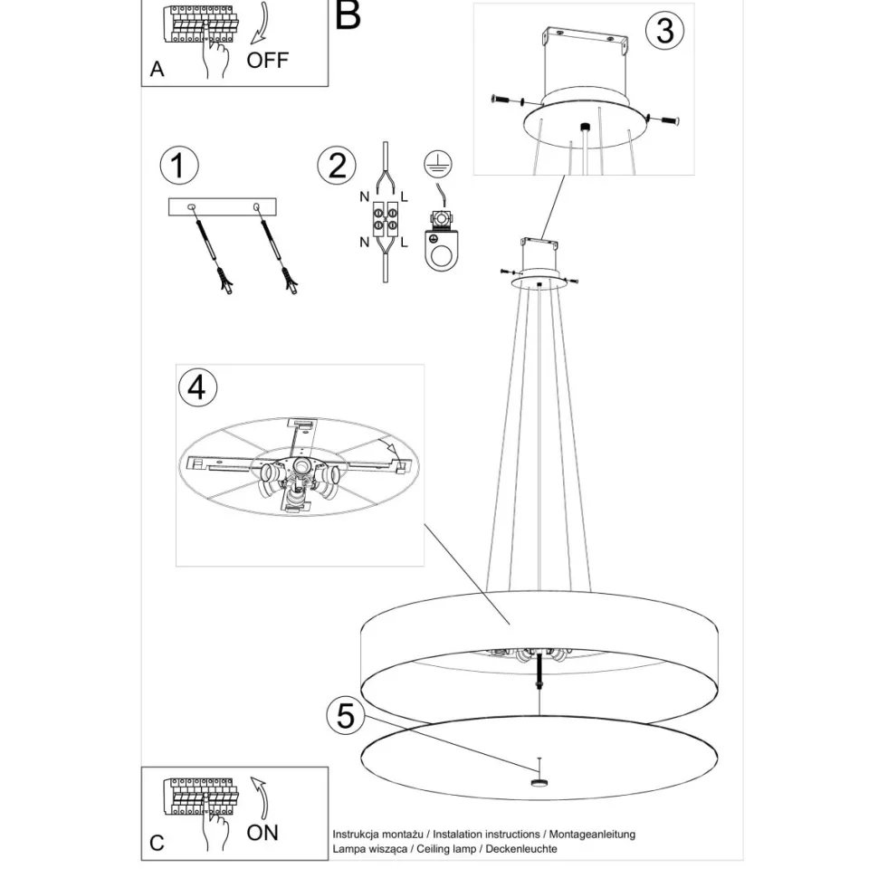 Żyrandol zaprojektowany został na podstawie koła. Dostępne są dwa klasyczne kolory metalowej obudowy: czarny i biały. Średnica plafonu dostępna jest w 7 rozmiarach od szerokości 30cm do 100cm. Skala zaprojektowany został w taki sposób, że szybki jest w montażu, a prosta forma gwarantuje łatwość czyszczenia. Żyrandol idealnie sprawdzi się w salonie, przedpokoju, hotelu czy restauracji.