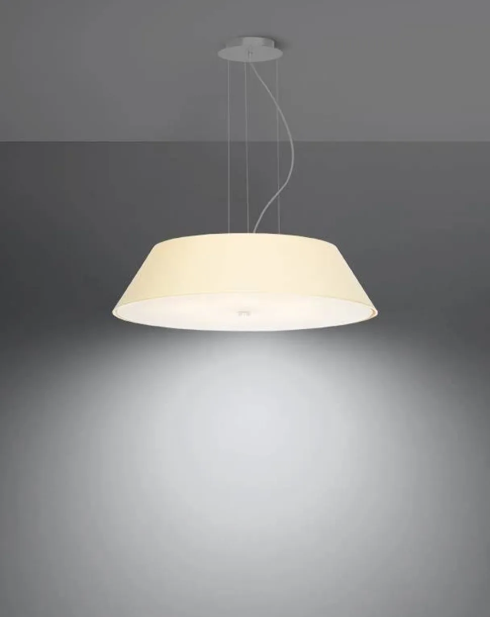 Ten nowoczesny żyrandol wisi na praktycznie niewidocznych linkach, dzięki czemu wydaje się, jakby tkaninowy abażur unosił się w powietrzu. Konstrukcja oraz oprawa żarówki wykonane są ze stali i obłożone tkaniną dostępną w dwóch kolorach. Od dołu znajduje się tafla mlecznego szkła, które doskonale rozproszy światło po całym pokoju. Żyrandol Vega dostępny jest w dwóch wymiarach średnicy – 60 i 70 cm, dzięki czemu bez problemu dostosujesz go do potrzeb swojego wnętrza.